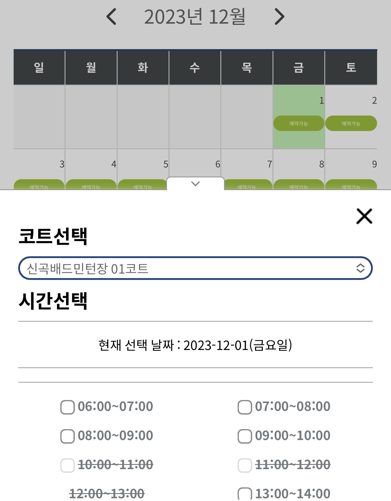 페이지 우측 위 메뉴버튼 클릭하여 '배드민턴장 대관신청' 메뉴로 진입하면 날짜/코트/시간을 선택하여 간편하게 예약할 수 있습니다.