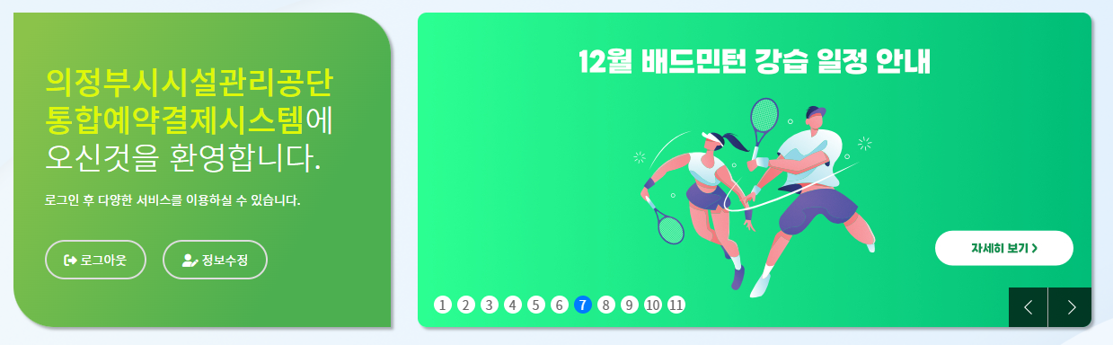 강습 일정 또한 시설관리공단 예약시스템 페이지의 배너를 통해서 쉽게 확인할 수 있습니다.