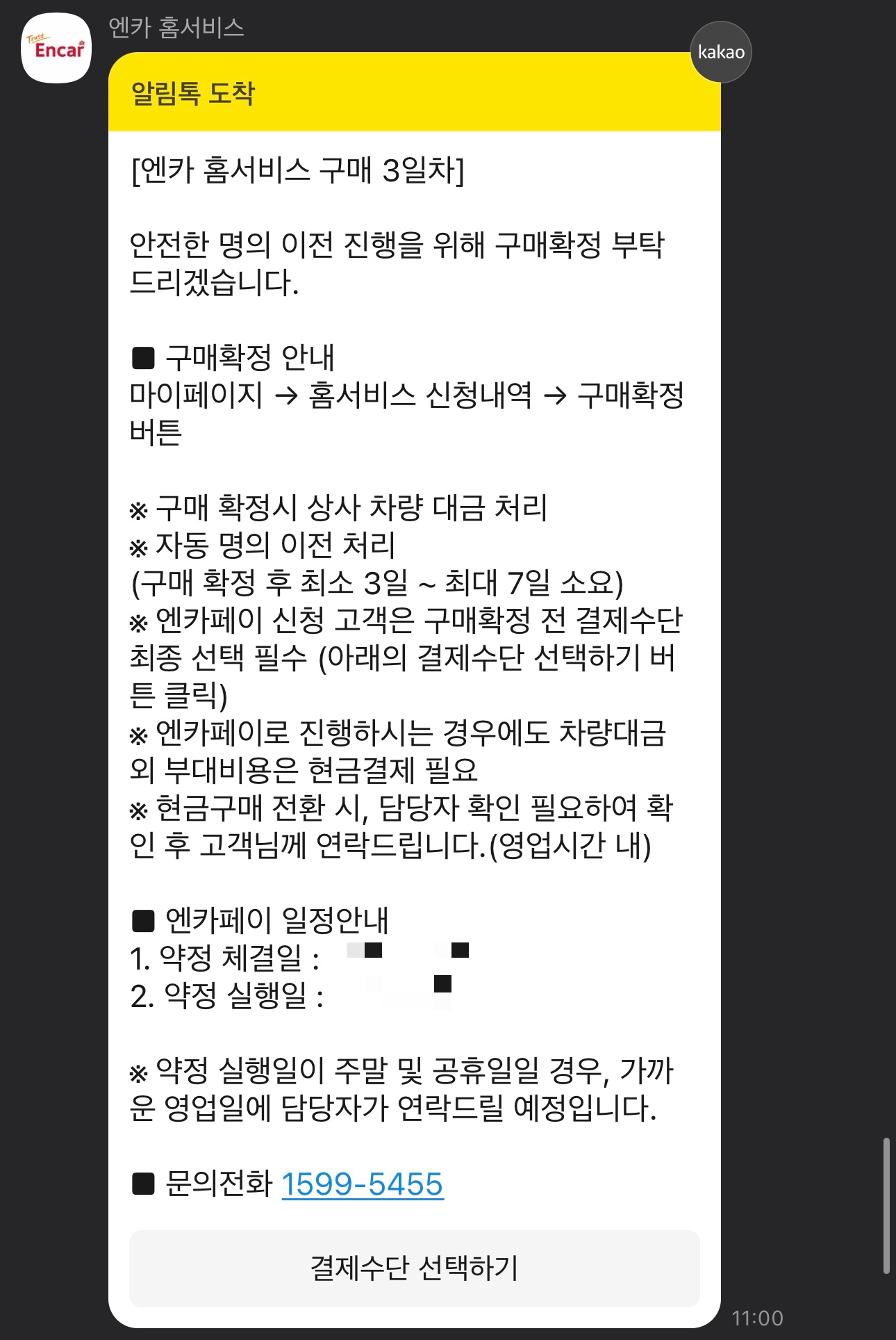 카카오톡을 통해 엔카에서 결제수단 선택하기 버튼이 보이는 안내 메세지가 옵니다.