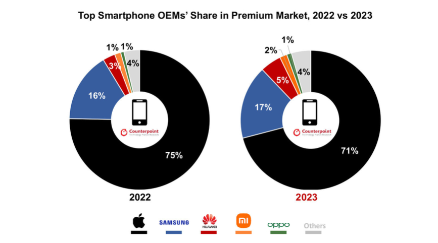글로벌 스마트폰 시장 점유율을 본다면 자랑스럽게도 삼성 갤럭시가 1위 수준으로 선전하고 있지만, 여전히 프리미엄 라인에서의 격차는 상당합니다.