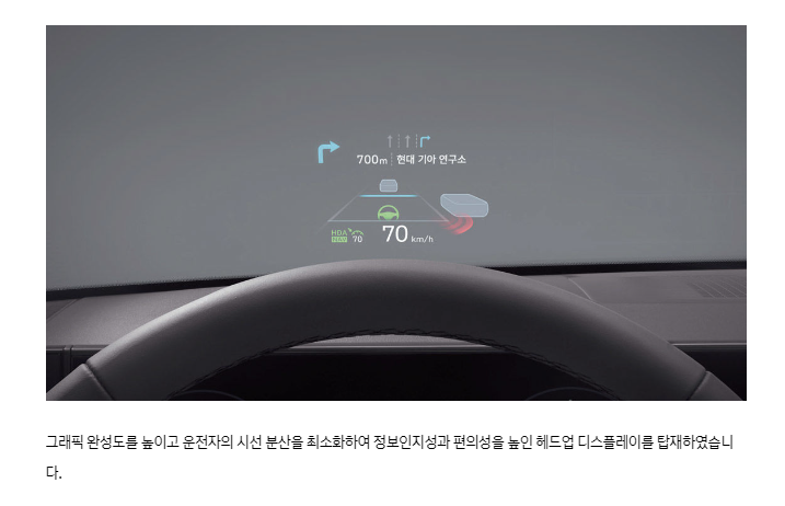 꽤나 다양한 정보들이 앞유리 적당한 공간에 보기 편하게 배치되어 있기 때문에 주행 중 시선을 계기판, 네비쪽으로 돌릴 일이 거의 없어져서 편한 주행에 정말 큰 도움이 되는 옵션입니다.