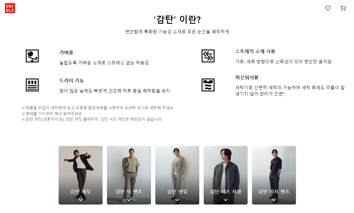 이 제품군의 가장 큰 장점이라면 편안한 착용감이 있고, 정장 느낌의 옷이면서도 세탁기로 세탁이 가능하다는 점을 앞세우고 있어요. 세탁기에 돌리더라도 망가지는 원단이 아니고 주름도 적어 관리가 매우 편하다는 것이죠.