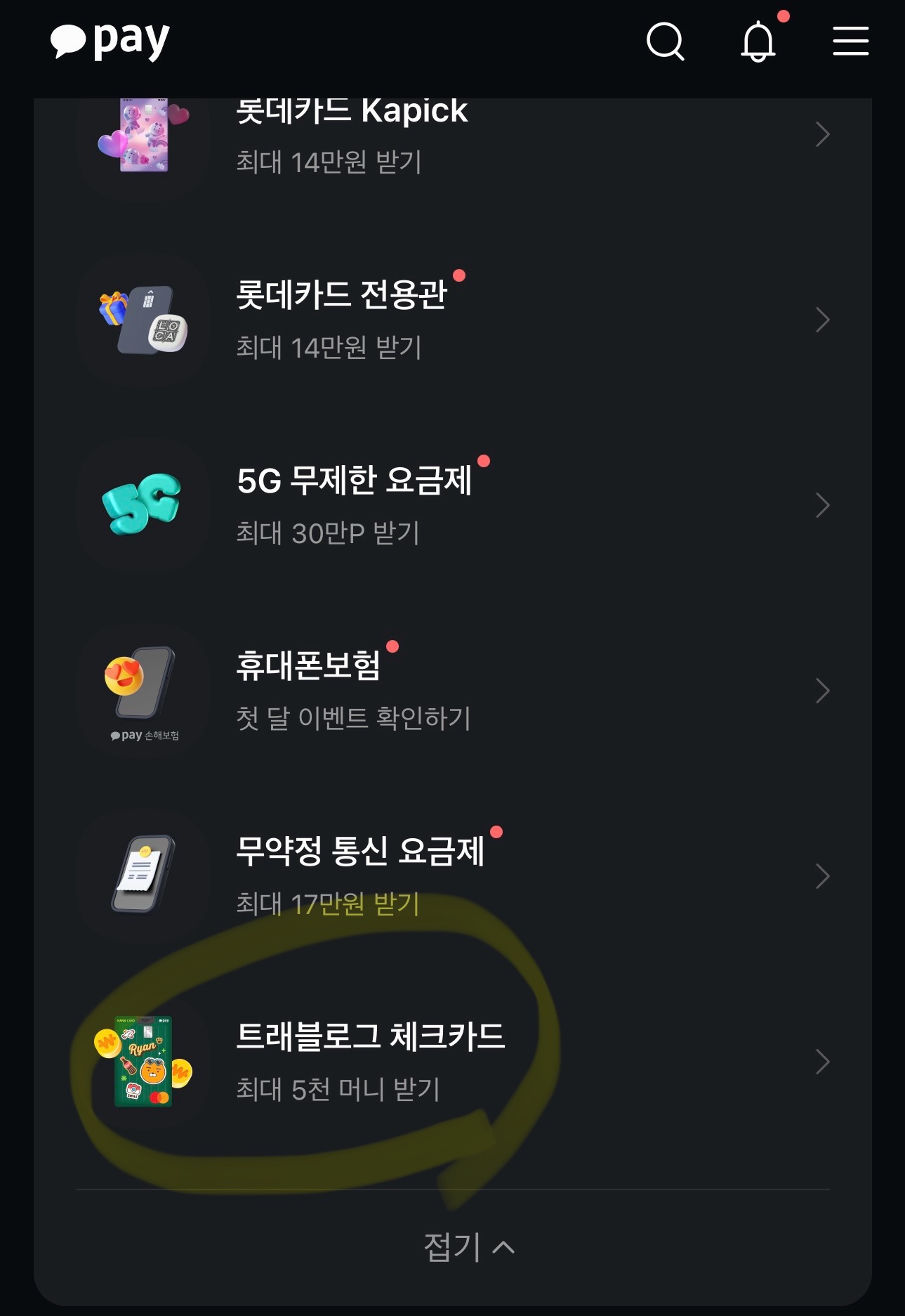카카오페이 앱 실행 - '혜택' 버튼 눌러 아래쪽으로 스크롤하다보면