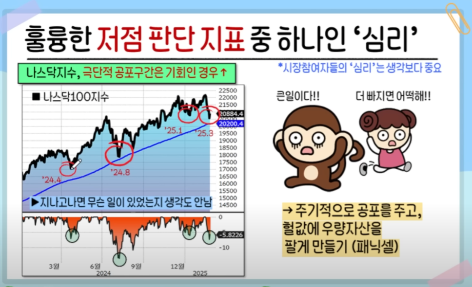 만약 현시점이 이번 미국주식 전반의 사이클의 저점이라고 한다면, 1년 후 진입하는 투자자들은 지금 주식시장 차트가 저점을 찍은 상황을 돌아보며 "저 때 샀으면 누구나 돈 벌었겠네?"라고 생각합니다.