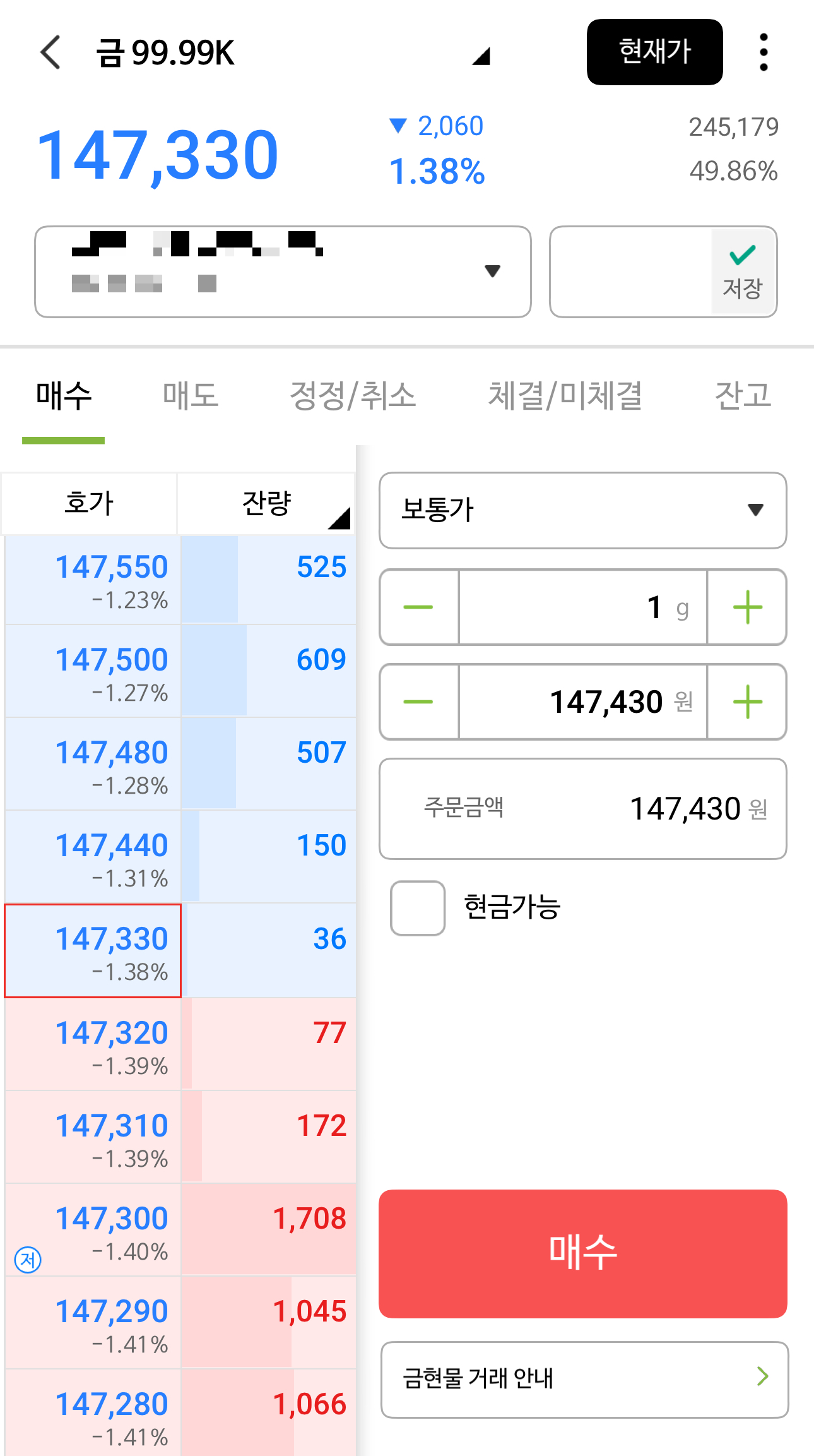 계좌를 생성하셨다면 이제 금현물 메뉴에서 1g 단위로 주식 거래하듯이 거래를 진행하시면 됩니다.
