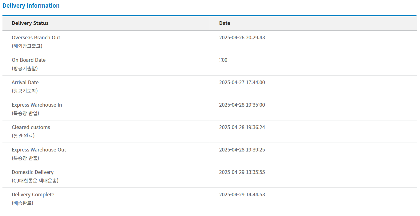 저는 4월 25일 금요일 새벽에 주문했고 4월 29일에 도착했으니 주말이 껴있는 해외배송임에도 총 4일밖에 걸리지 않았네요.