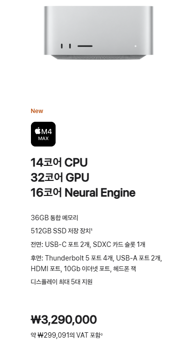 칩, 메모리, SSD를 모두 한단계씩 업그레이드하면 3,290,000원이 되는데 그렇다면 M4 Max칩을 탑재한 맥스튜디오의 가격과 동일해지니까 무조건 맥스튜디오로 가셔야합니다. 맥스튜디오 기본모델은 14코어 CPU, 32코어 GPU, 36GB 통합메모리, 512GB SSD 저장장치이며 SD카드슬롯까지 추가되며 썬더볼트5 포트가 4개, A타입 포트 2개, 10GB 이더넷포트, 디스플레이는 최대 5대 지원하는 등 맥미니와 체급이 다른 성능을 자랑합니다.