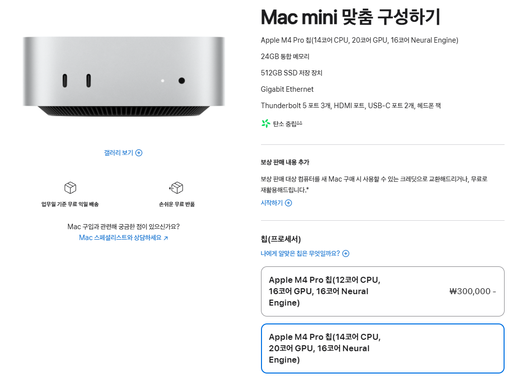 맥미니 M4 기본모델을 선택하신다는 것은 가격적인 측면을 고려하시는 합리적인 소비를 하시려는 것인데 고작 1TB로의 업그레이드에 60만원, 2TB에는 120만원이라는 가격은 매우 터무니없어요.