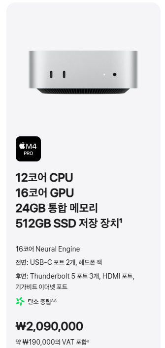 · M4 기본모델에 비해 기본적으로 24GB의 통합 메모리와, 512GB SSD를 장착했다는 점(여전히 부족한 면은 있지만), 메모리대역폭도 120GB/s에서 273GB/s로 넓어지고, Thunderbolt 4 포트도 3개에서 Thunderbolt 5 포트 3개로 업그레이드되는 장점이 있습니다.