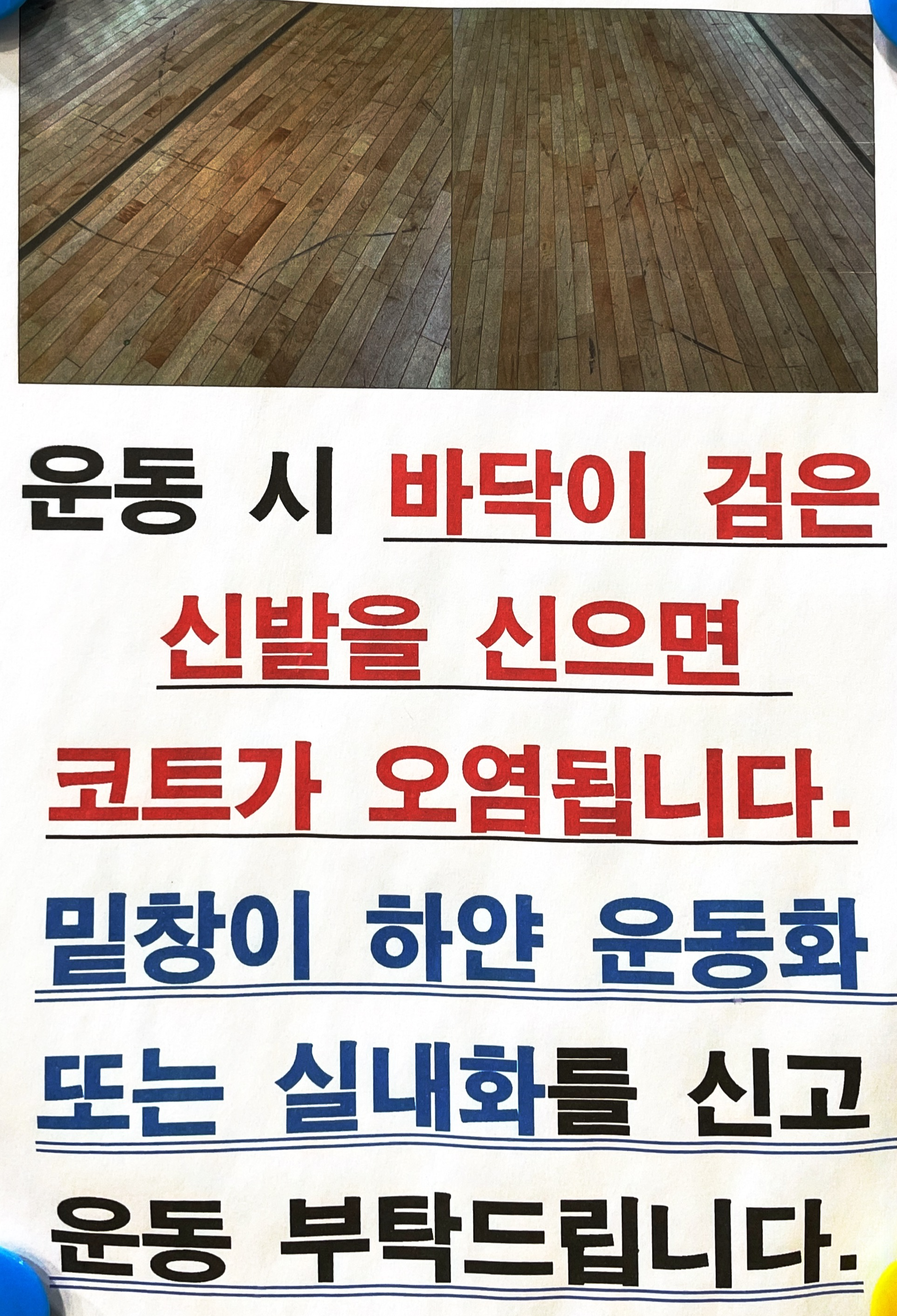 다만, 하얗지 않더라도 non-marking(바닥에 자국을 남기지 않는) 기능이 들어간 신발은 괜찮습니다. 실내 코트 전용 신발이 아닐 경우 코트가 오염되고, 미끄러짐 등으로 부상 위험 또한 있어요!