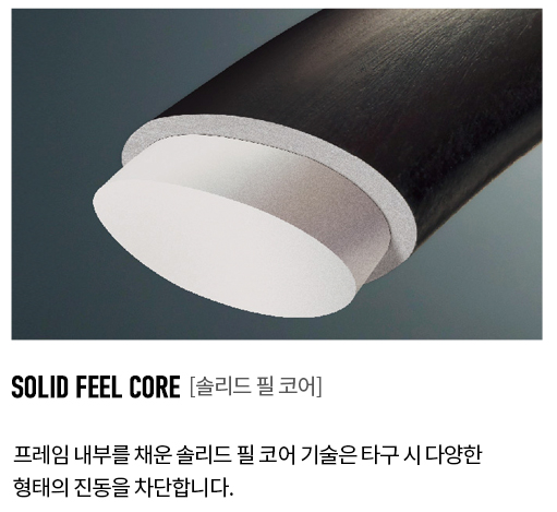 솔리드 필 코어 기술이 적용되어 진동을 많이 잡아줍니다. 이런 라켓으로 치다가 그렇지 않은 라켓을 사용해보면 주로 '잔진동'이라고 표현되는 속이 비어있는 느낌이 든다는 이야기를 많이 들었습니다.