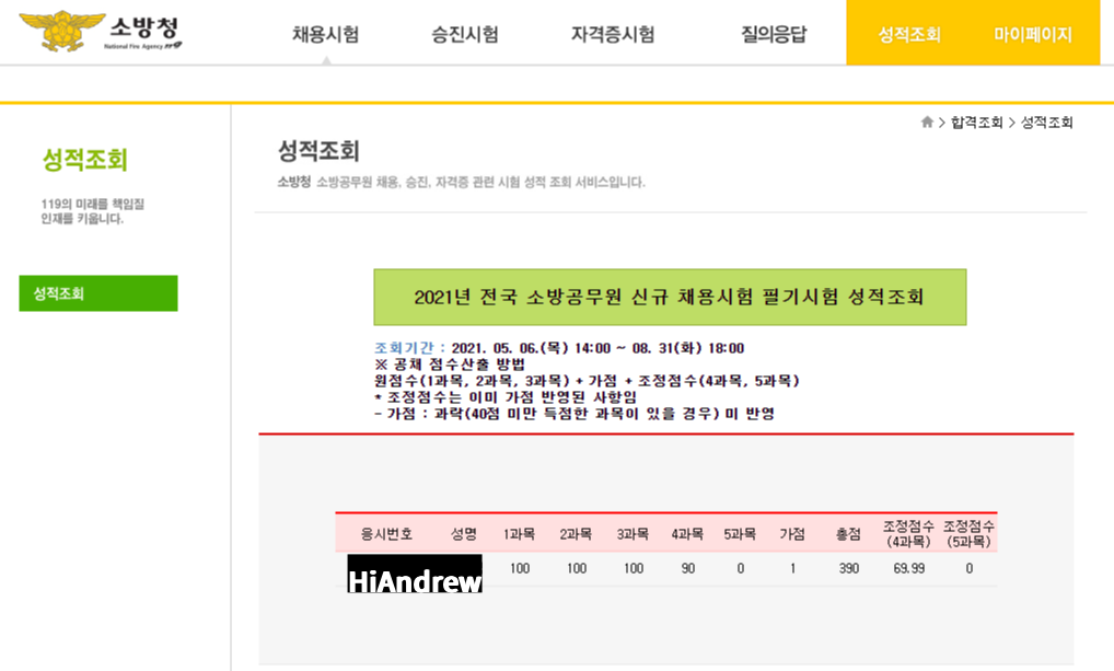 - 소방직 준비하시는 분들께서 제 필기 합격으로 인해 불합격하는 일이 생기면 안되므로 일부러 한 과목 마킹을 하지 않아 0점을 받았습니다.