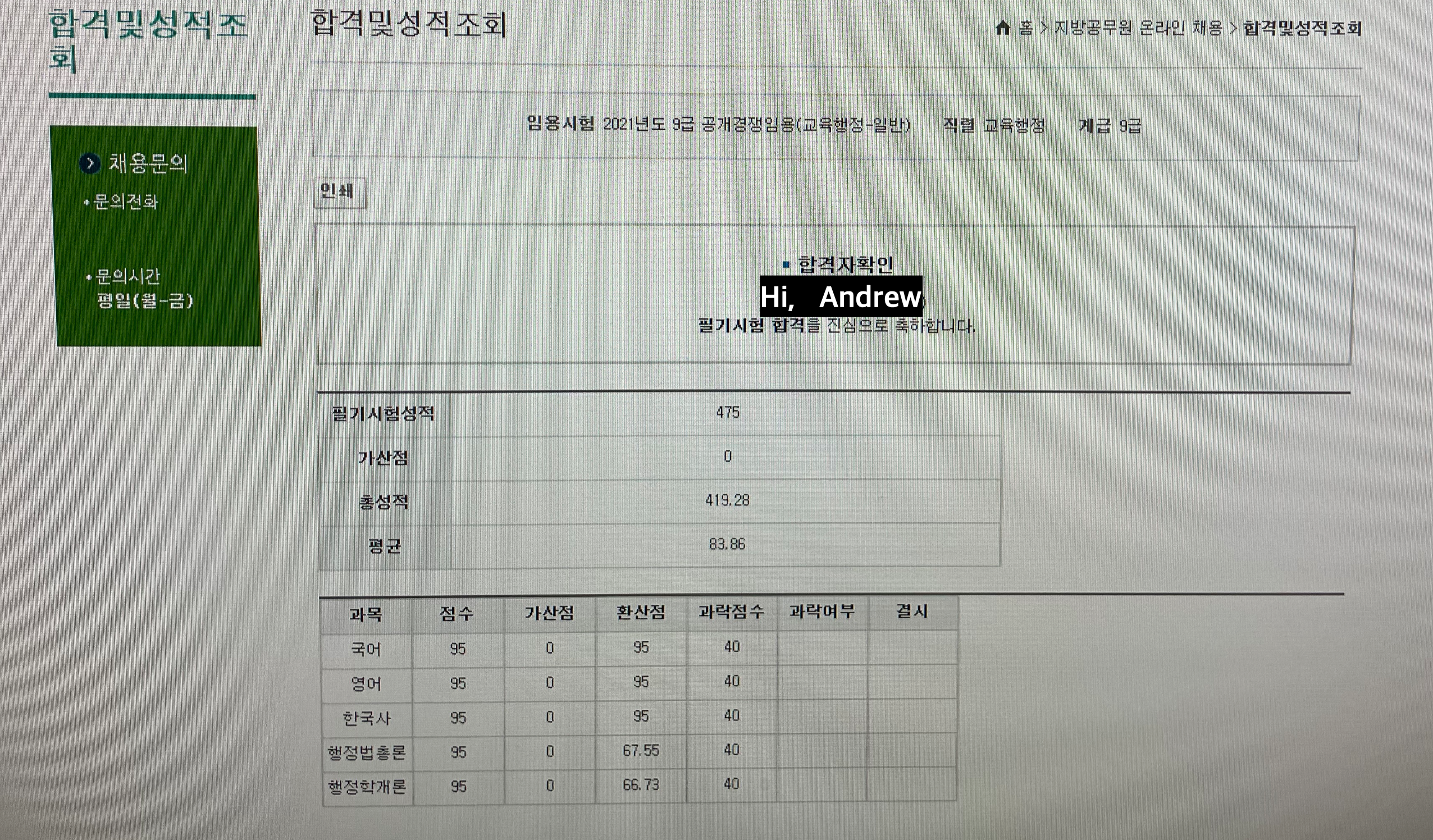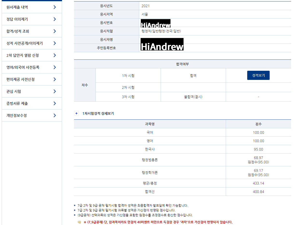 - 이 때 일반행정 경쟁률이 100.37:1이어서(선발인원 456, 응시인원 42,828) 합격할 수 있을까 의문을 가졌었는데 전과목에서 3개를 틀리는 좋은 성적으로 경쟁률이 무색하게도 필기 합격할 수 있었습니다.