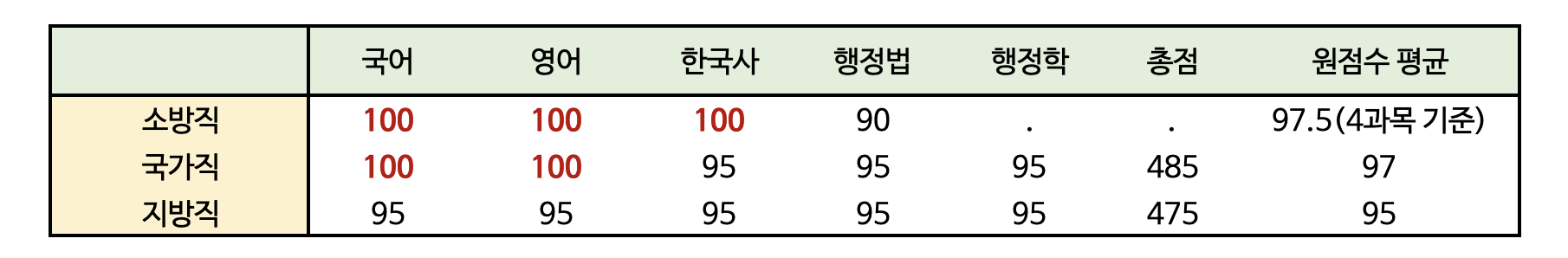 각자 다른 상황에 있는 독자분들이 제 합격 수기를 어느 정도의 기준점으로 삼아 방향 설정에 도움이 되길 바라며 개인적으로 과목 별 어느 정도 베이스(수험 시작 전 이미 가지고 있는 지식)을 가지고 공무원 시험을 시작했는지 공유하겠습니다.