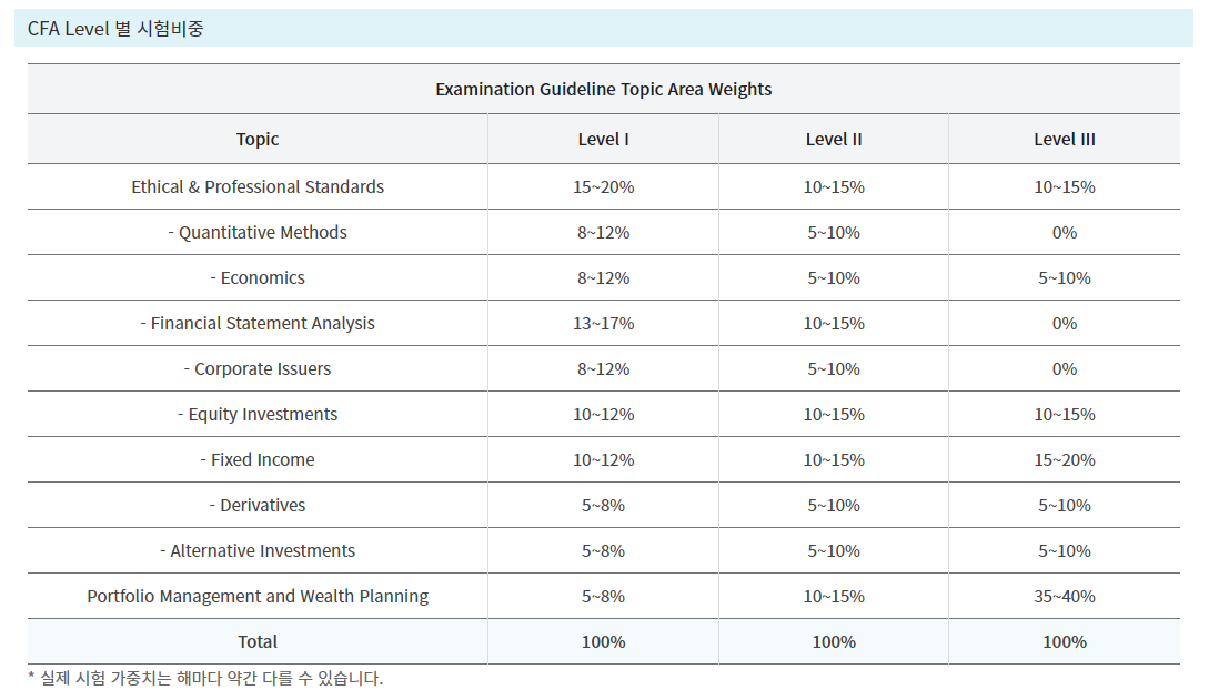 - CFA 시험의 핵심 주제로서, 1ㆍ2ㆍ3차에서 고루 높은 비중을 차지하는 과목입니다.
