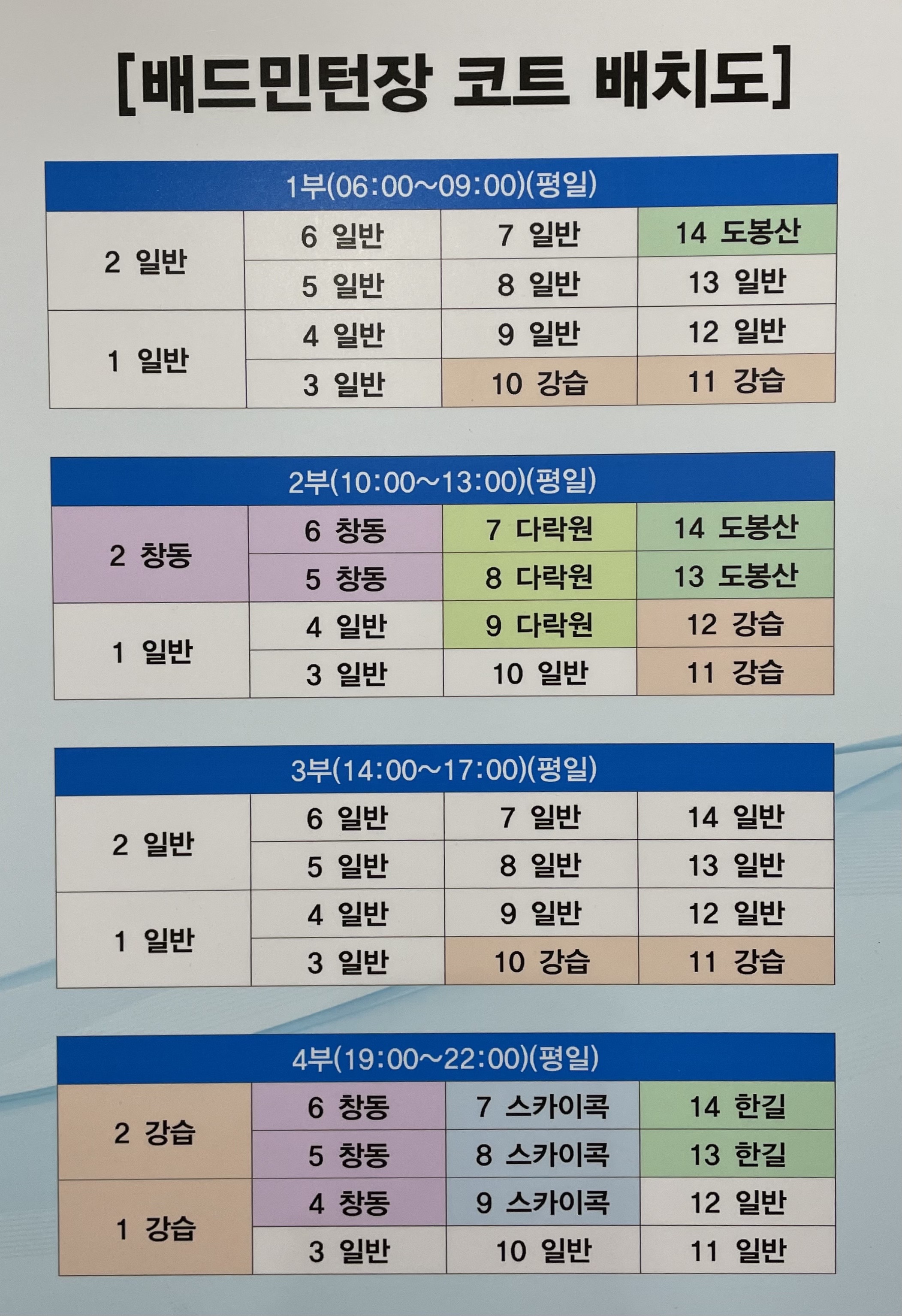 - 2022년 12월 기준 배드민턴장 코트 배치도는 아래 사진을 참고해주세요!