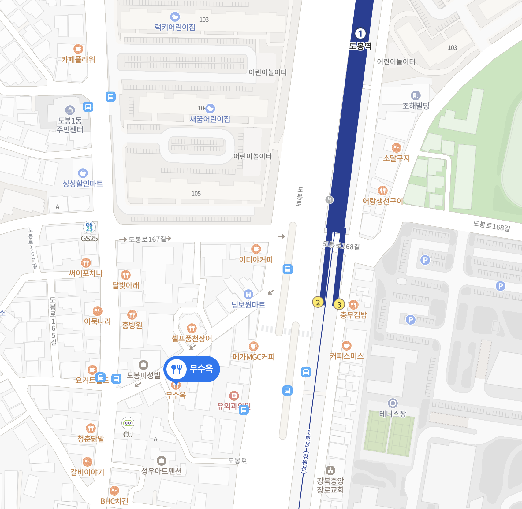 지하철: 1호선 도봉역 2번출구에서 도보로 금방입니다.