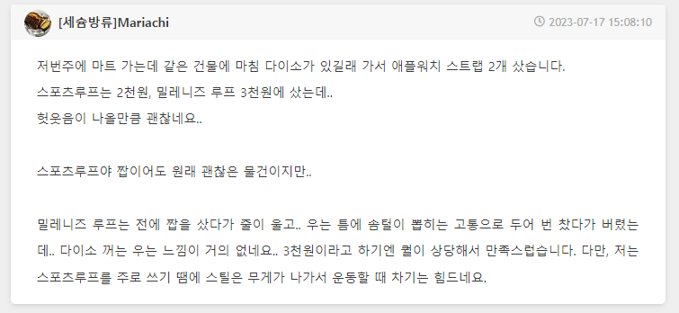 정품을 많이 사서 쓰다가 다이소 밴드를 사용하신 분들의 후기(유튜브, 블로그 등)를 보며 많이 공감을 한 부분이 있는데 "그동안 난 뭘 산거지?"라는 헛웃음이 나는 반응 ㅋㅋㅋㅋㅋ입니다.