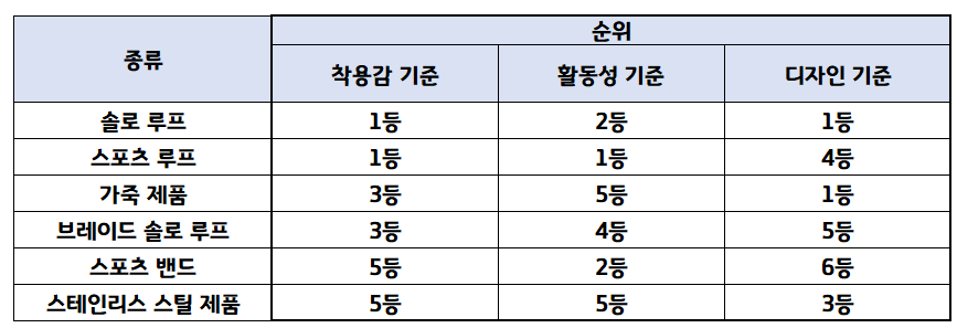 착용감, 활동성, 디자인, 정품 기준 가성비 고려 20점 만점