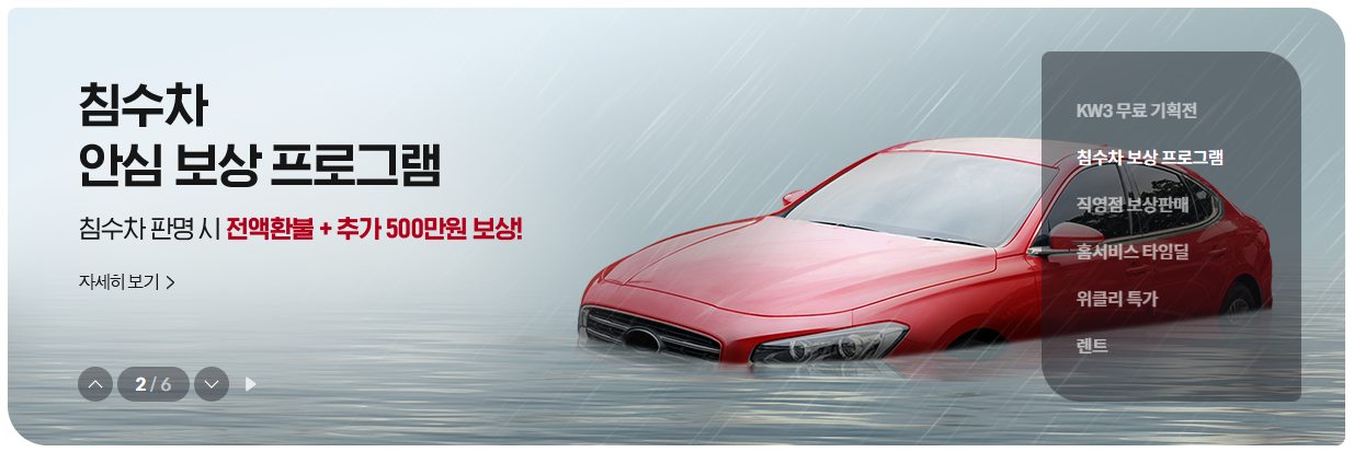 중고차 거래에 있어서 가장 걱정을 하는 부분 중 하나가 바로 이 침수차가 아닐까 싶어요. 그런데 침수차 보상 프로그램을 통해 침수차는 취급하지 않는다는 자신감을 보이고 있네요.