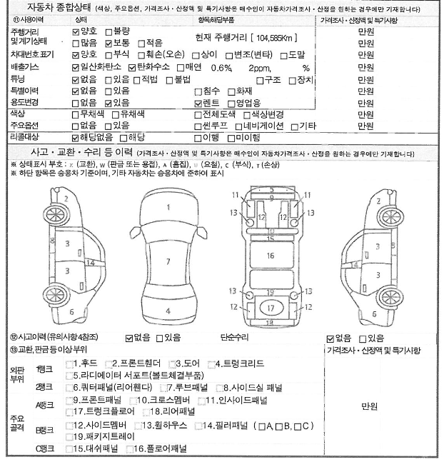 위 이미지 공통적으로 1페이지 수리내역엔 판금 등 내역이 체크가 안 되어 있었지만, 중고차 특성상 판금도색이 있을 수 있다는 코멘트가 있네요. 그렇다면 실제로는 완전무사고가 아니라 다음 설명드릴 무사고의 범주에 들어가는 차량일지라도 딜러는 완전무사고로 광고하고 팔 수도 있다는 것이죠. 매입해갈 땐 완전무사고 아니라고 할거면서