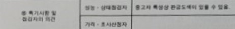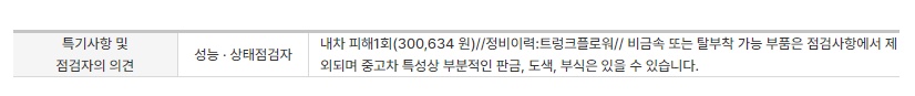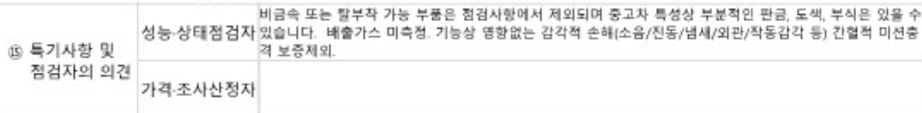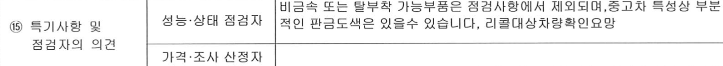 - 교환까지 가지 않은 판금 또는 용접의 경우 성능장에선 성능점검기록부 1페이지 수리 이력에는 아무 표시를 안 해두고 3쪽 정도에 있는 특기사항 및 점검자의 의견 란에 다음 이미지와 같은 면책을 위한 문장을 써둡니다.