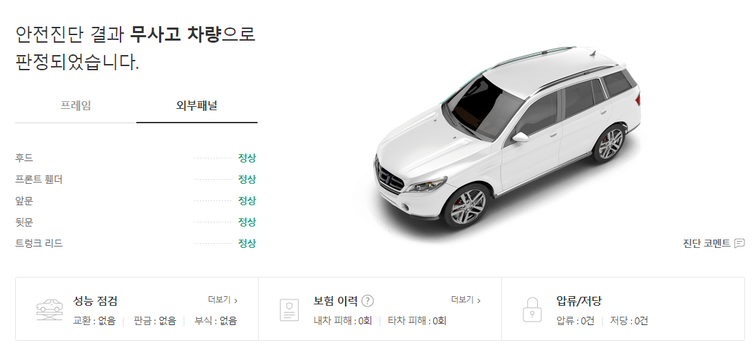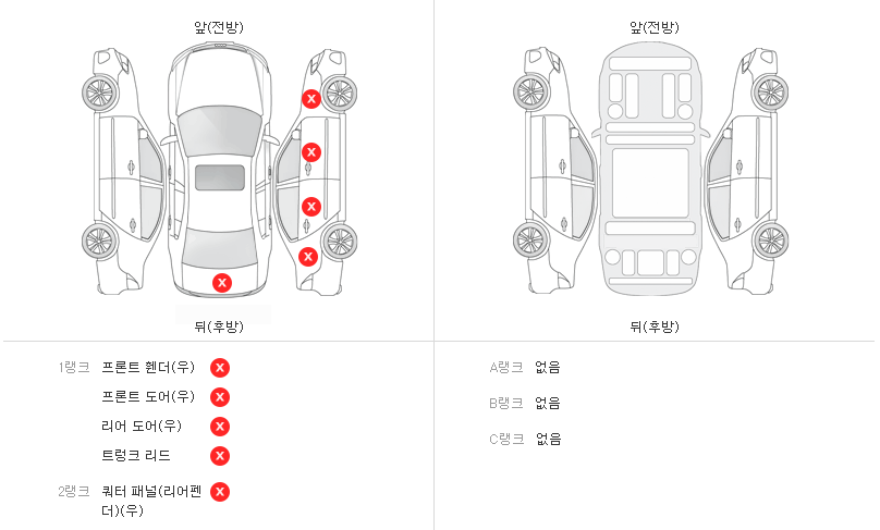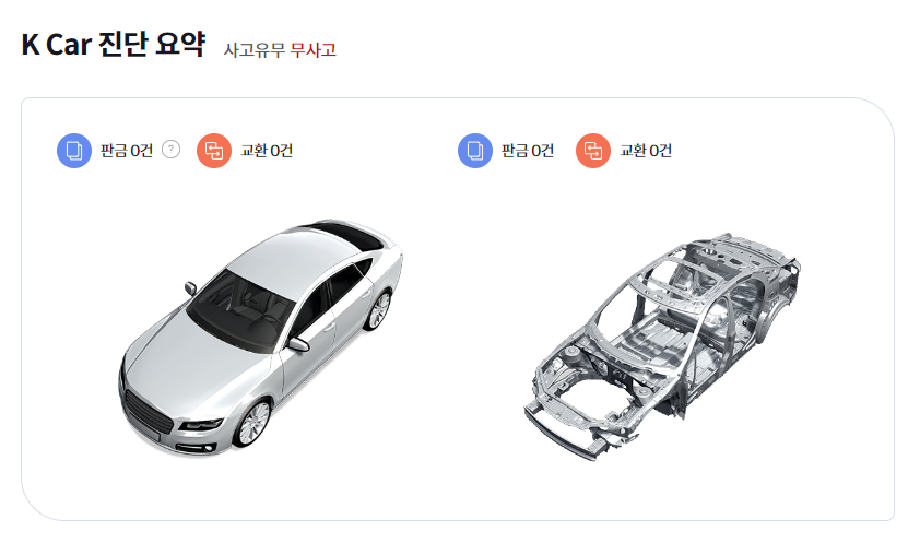 | 보험이력상 사고 | 외부패널 손상/수리 이력 | 프레임 손상/수리 이력 | |