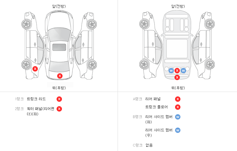 후방 추돌이 있었던 차량의 예시입니다. 외판 트렁크 뿐 아니라 프레임인 리어패널, 리어 사이드 멤버까지 교환이력이 있는 '사고차'입니다. 그나마 후방쪽 손상은 차에게 가는 부담이 적다고 말씀하실 수도 있지만, 그래도 구매자 입장에서 사고차를 고려하기 쉽지 않은 것이 사실이며 저도 추천드리지 않습니다. 프레임을 먹을 정도의 큰 사고에 의해 문제를 일으킬 수 있는 요인이 새로 생겼거나/강화되었을 수 있습니다.