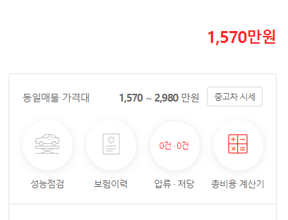 또한, 딜러는 바보가 아닙니다. 딜러가 차를 보는 눈은 프로 수준일 것입니다. 그런데 동일매물 가격대를 보았을때 시장최저가(1,570만원)로 차량을 판매하고 있습니다. 가격만 봐도 차 상태가 짐작이 갑니다.