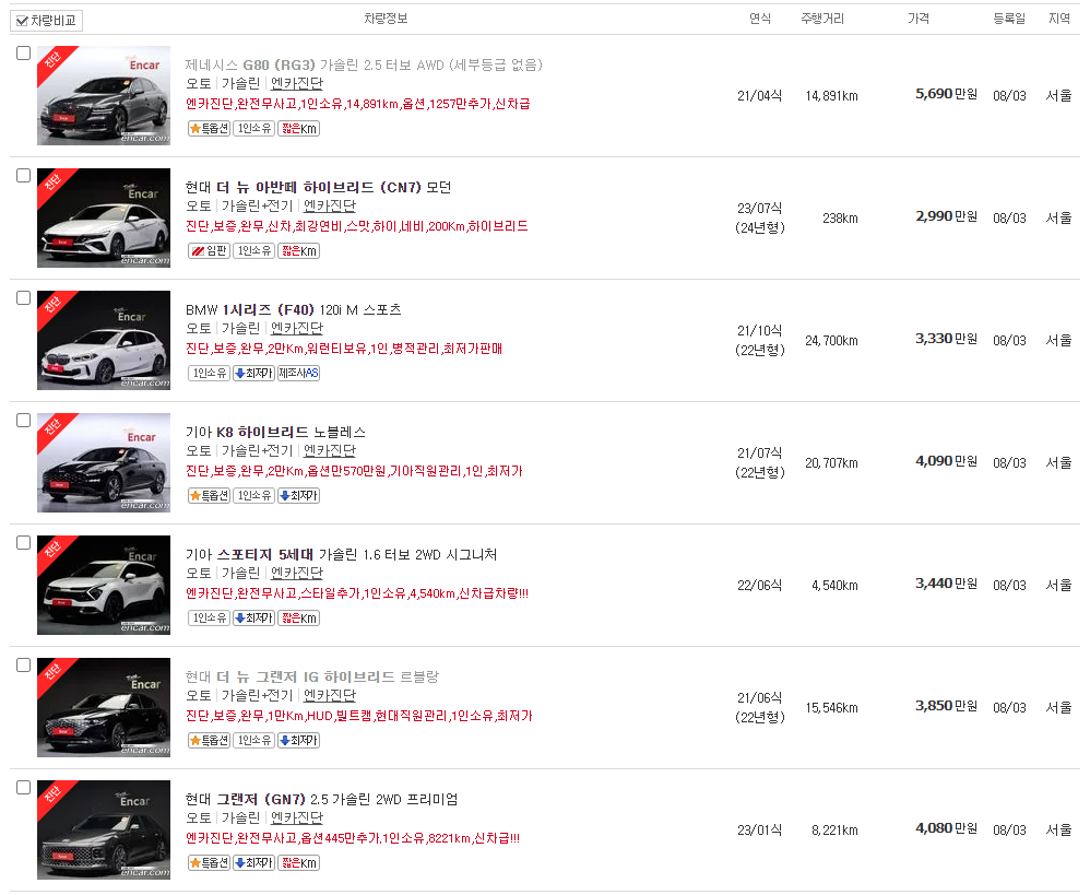 위와 같이 엔카 진단차량만 따로 검색할 수도 있습니다.