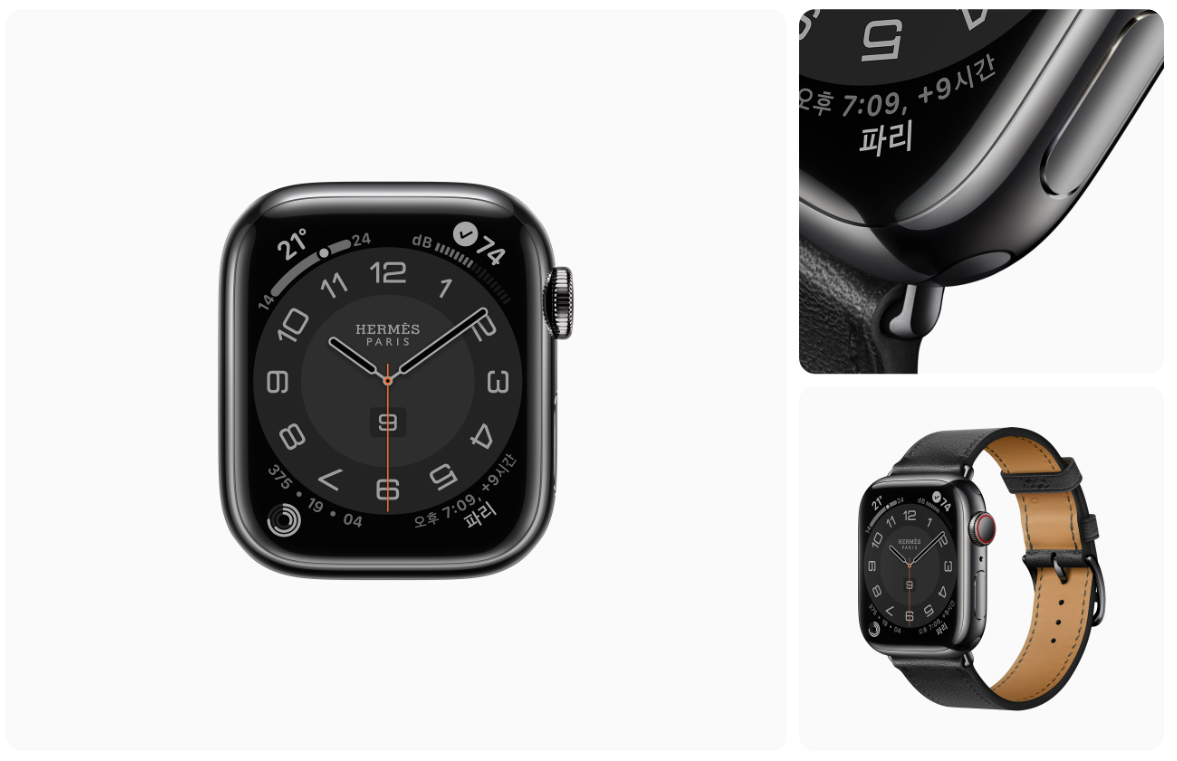 에르메스 모델은 스테인리스 스틸 마감 + 애플 제품 중 가장 블랙에 가까운 고급스런 색상이에요.