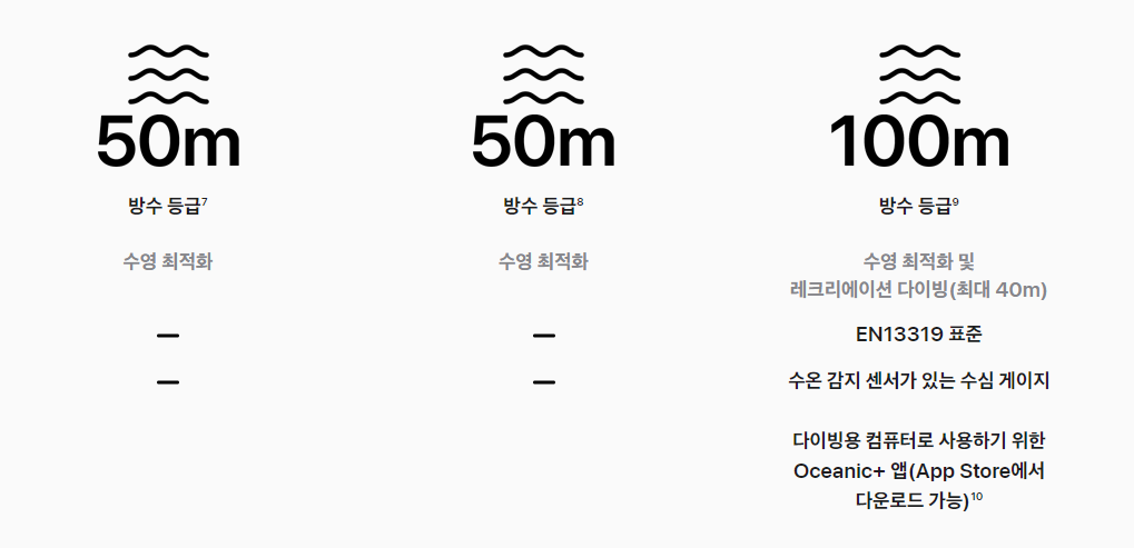 2015년 출시된 애플워치 첫번째 시리즈를 제외하면 수영이 가능하다고 쓰여있습니다. 2022년 출시된 워치 울트라의 경우 스쿠버 다이빙까지 가능한 수준이구요.
