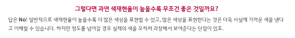 LG 공홈 피셜에 따르면 색재현율이 무조건 높은 것이 정답은 아니라고도 하죠.(그러면서 LG 제품도 고급 제품일수록 높은 색재현율이 들어가긴 하지만)