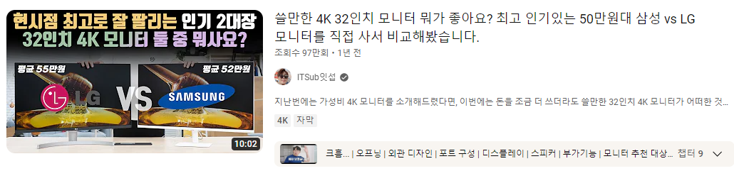 즐겨보는 잇섭님의 1년 전 영상에서도 최고 인기있는 50만원대 4K 32인치 LG 모니터로 32UN650를 뽑으셨네요! ㅎㅎ