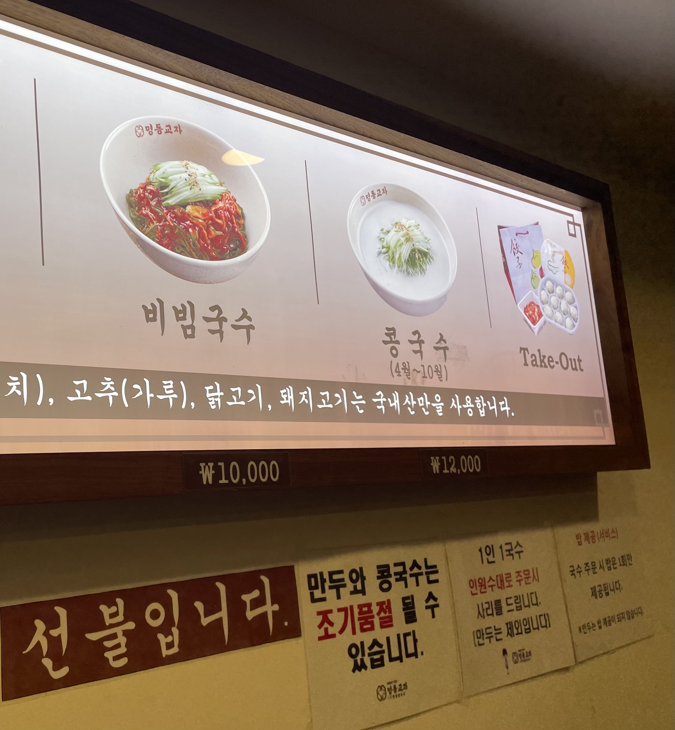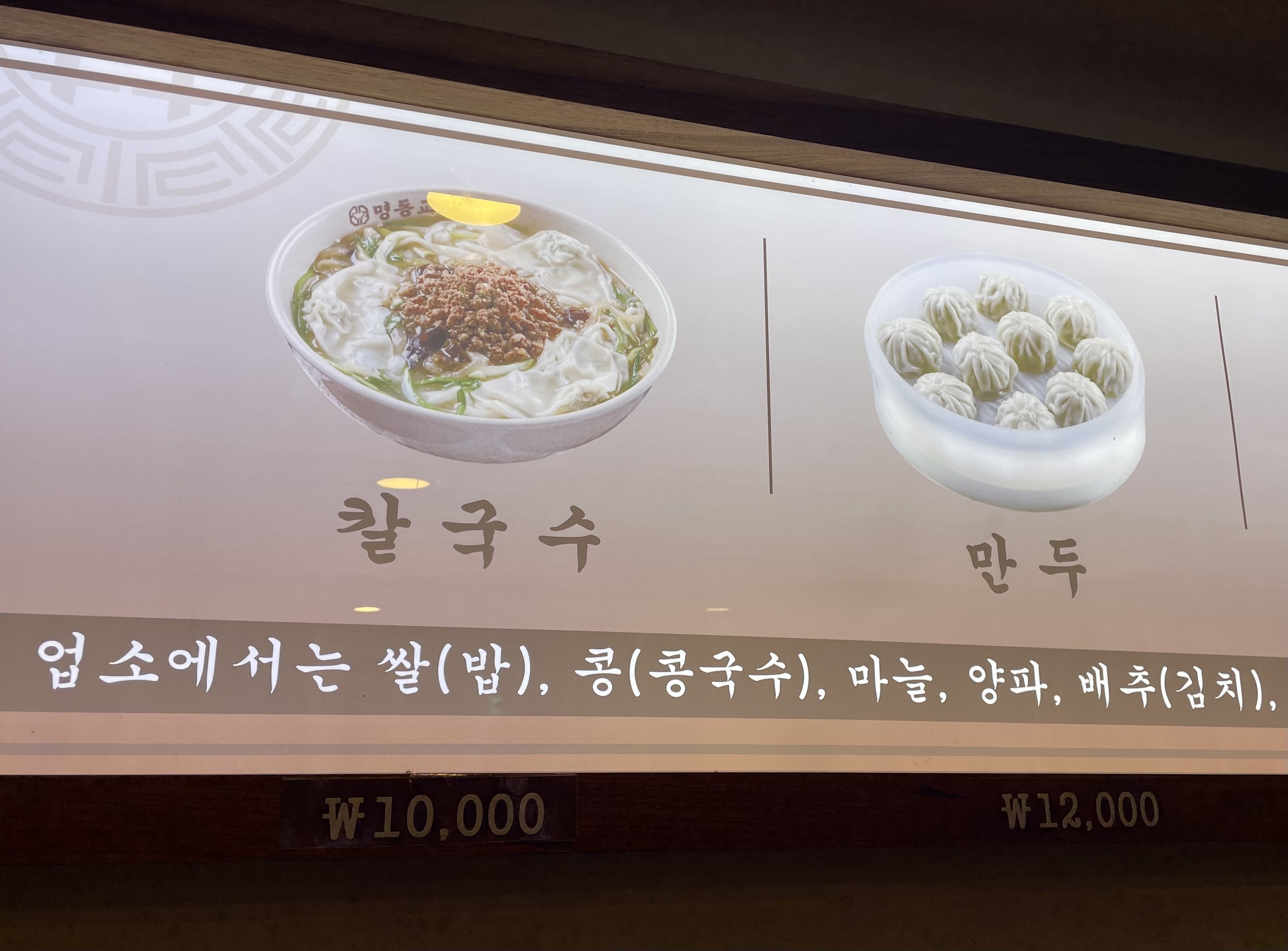 메뉴는 칼국수 / 비빔국수 / 콩국수 / 만두로 구성되어 있어요.