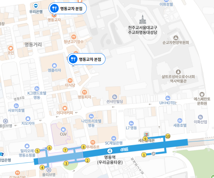 4호선 명동역 8번출구로 나오자 마자 좌측에 있는 골목으로 쭉 들어가다보면 길 우측에 본점이 먼저 보이고 조금 더 걷다 보면 좌측에 분점이 보입니다.