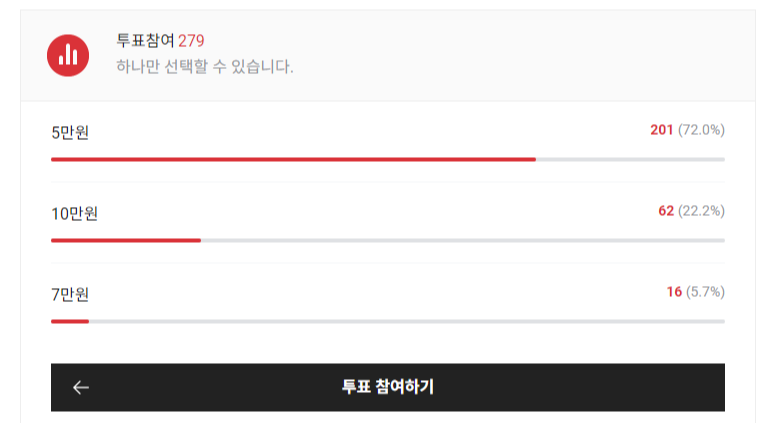 그나마 원문에는 '약간 가까운, 가끔 같이 저녁을 먹는' 정도의 사이라는 서술이 있기 때문에 10만원이 적당하다는 표도 일부 보이지만, 제가 구분하는 상황과 딱 맞아 떨어졌으면 5만원 표가 더욱 지배적일 것이라는 예상입니다. 참고로, 저도 축의금을 받아보았지만 7만원을 내는 경우는 없었습니다.