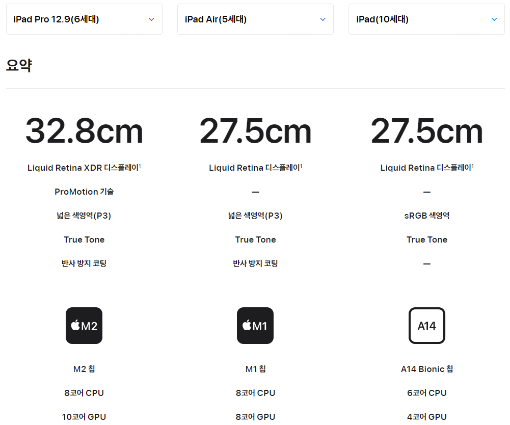 | 디스플레이 | 동급(Liquid Retina) | 12.9인치에 한하여 더 좋은 화면 (Liquid Retina XDR) |