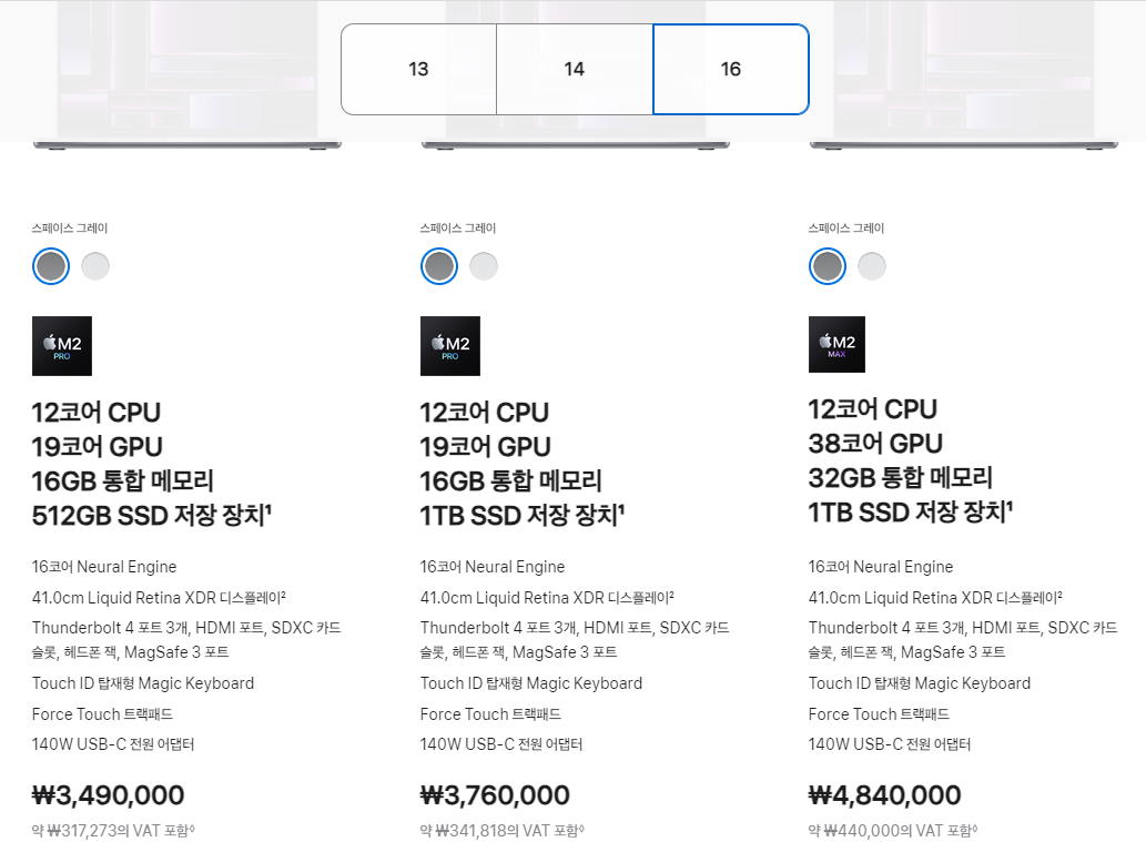 창작 작업을 주로 하시는 분들은 맥북에어보다 뛰어난 성능의 맥북을 원하실텐데, 예를 들어, 14인치 맥북 프로 중간 모델인 12코어 CPU, 19코어 GPU, 16GB 램, 1TB SSD 정도를 보신다면 3,490,000원이 됩니다. 350정도의 예산이라면 최상급 윈도우 노트북들에 대한 선택의 폭이 넓어지겠죠?