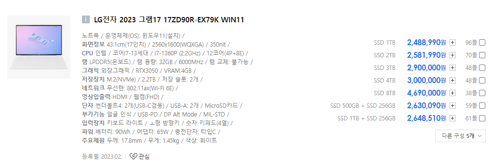LG 2023 17인치 그램 - i7 13세대, 램 32GB, SSD 4TB 모델을 사도 300만원인데 말이죠!
